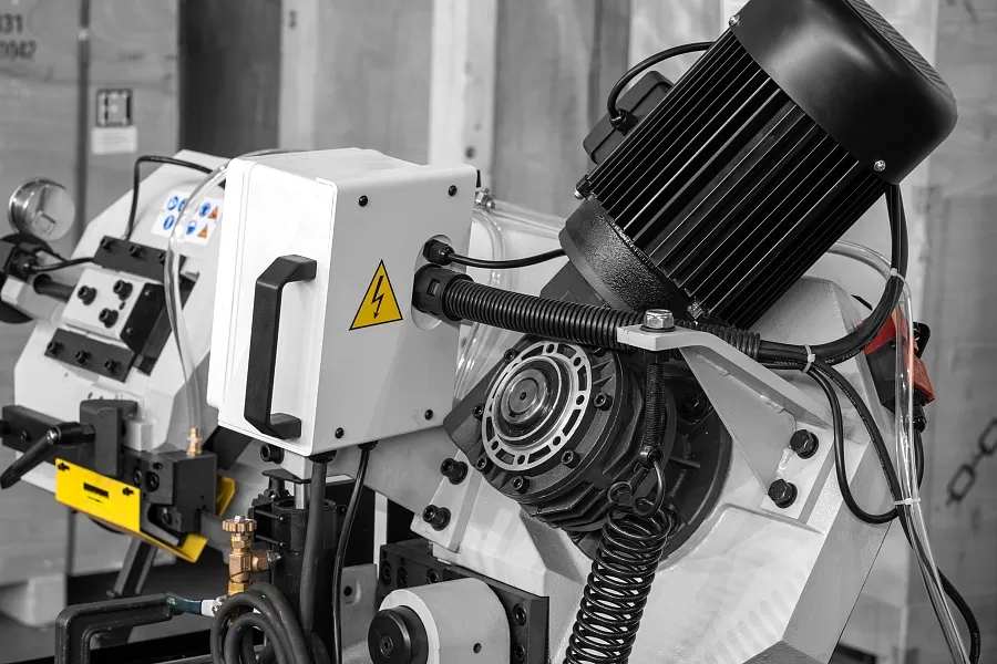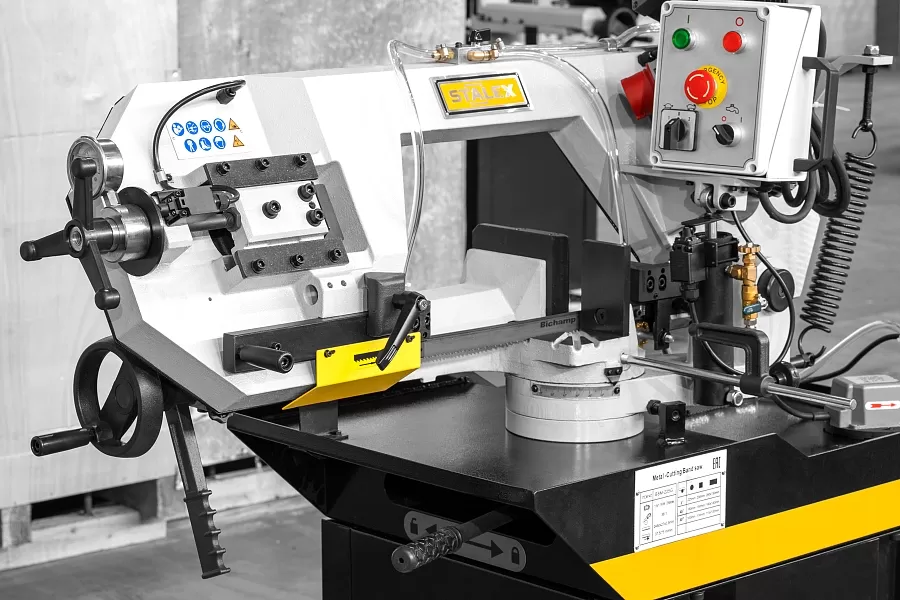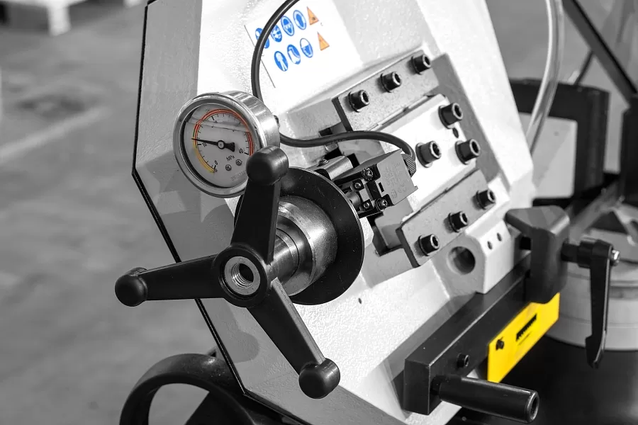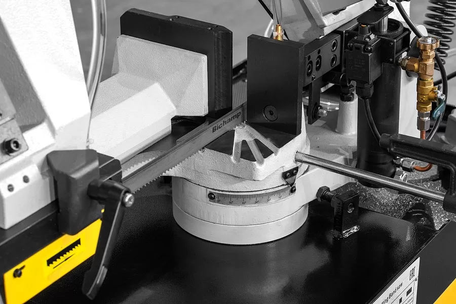 Ленточнопильный станок имеет быстрорегулируемые тиски для резки под углом, поворачивается рама, а не заготовка. Тиски с системой быстрого отвода ускоряют процесс смены заготовки (ускоренный отвод подвижной губки происходит без вращения маховика). Зажим заготовки осуществляется тисками вручную, подача заготовки — также вручную. Наличие системы СОЖ в стандартной комплектации – позволяет добиться высокой производительности.